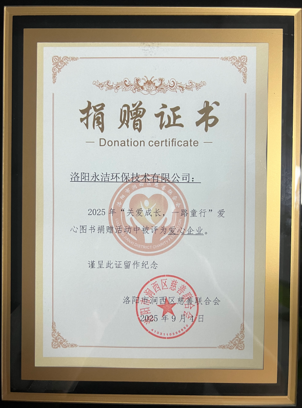 在2025年“關(guān)愛成長,一路童行”愛心圖書捐贈活動中,洛陽永潔環(huán)保技術(shù)有限公司積極參與,以實際行動支持公益事業(yè),被洛陽市澗西區(qū)慈善聯(lián)合會評為愛心企業(yè)。